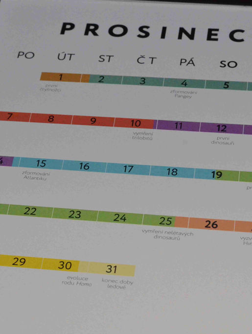 Nejde o běžný kalendář. Jde o cestu hlubokým časem: celá časová osa Země (přibližně 4,567 miliardy let) je zkondenzovaná do jednoho roku. Každý den roku 2026 tak odpovídá 12 512 329 letům geologické historie naší planety. V průběhu měsíců jsou zvýrazněny různé geologické události, které vám pomohou představit si těžko představitelné časové úseky geologické historie Země. Důležitým prvkem kalendáře je zahrnutí geologických eónů a období – barevných pruhů pod daty. Barvy odpovídají oficiální chronostratigrafické tabulce, takže je ještě snazší zorientovat se, kde v historii naší planety se v daný den roku právě nacházíte.